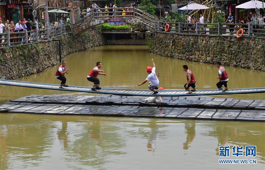 在廣西融水雙龍溝森林旅游度假區(qū)夢嗚苗寨,幾位搬遷戶協(xié)助游客挑戰(zhàn)“搖擺橋”(6月21日攝)。近年來,融水打造原生態(tài)苗族文化體驗園——夢嗚苗寨,讓搬遷進城的貧困戶住進復原建設(shè)的老房子。景區(qū)提供綠化保潔、游樂設(shè)施管理、民族歌舞表演等工作崗位,多渠道增加貧困戶收入。新華社記者黃孝邦攝