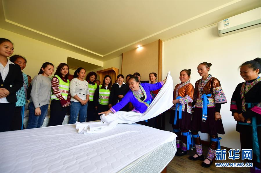 在廣西融水苗族自治縣香粉鄉(xiāng)雨卜村,扶貧工作隊員和致富帶頭人在學習客房服務(wù)技能(2019年11月4日攝)。新華社記者黃孝邦攝