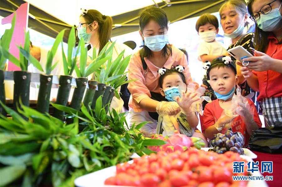 6月23日,參加生日會的市民游客為大熊貓制作“生日蛋糕”。新華社記者唐奕攝