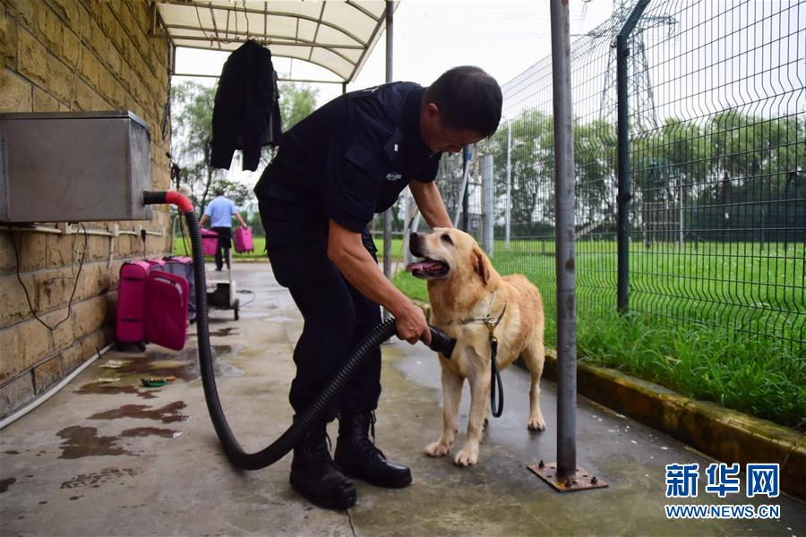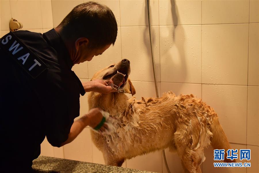 6月24日,訓(xùn)導(dǎo)員周吉榮為緝毒犬“多多”洗澡。 新華社記者 鄭夢(mèng)雨 攝