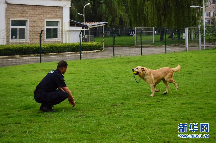 6月24日,訓(xùn)導(dǎo)員周吉榮調(diào)教緝毒犬“多多”。新華社記者 鄭夢(mèng)雨 攝