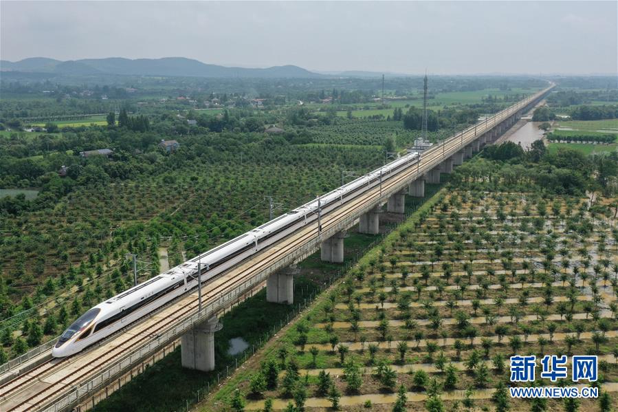 6月28日,列車在商合杭高鐵浙江安吉縣境內(nèi)行駛(無人機照片)。新華社記者黃宗治攝