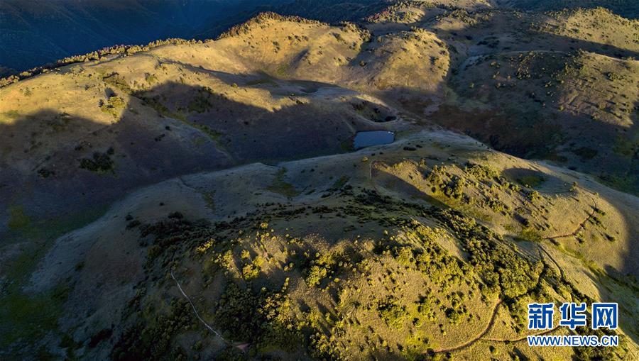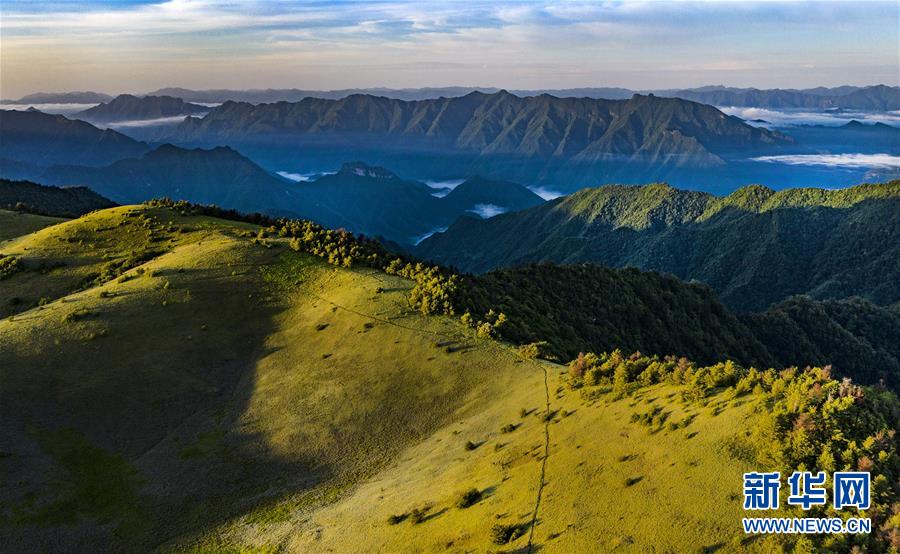 6月30日,朝霞照耀下的神田草甸與遠(yuǎn)處的群峰(無(wú)人機(jī)照片)。位于陜西省安康市嵐皋縣與重慶市城口縣交界處大巴山神田主脊北坡的神田草甸,面積超過1.1萬(wàn)畝。夏日的朝霞中,起伏的草甸仿佛一塊寬大無(wú)邊的綠色地毯,鑲嵌在大巴山上,如詩(shī)如畫。新華社記者陶明攝