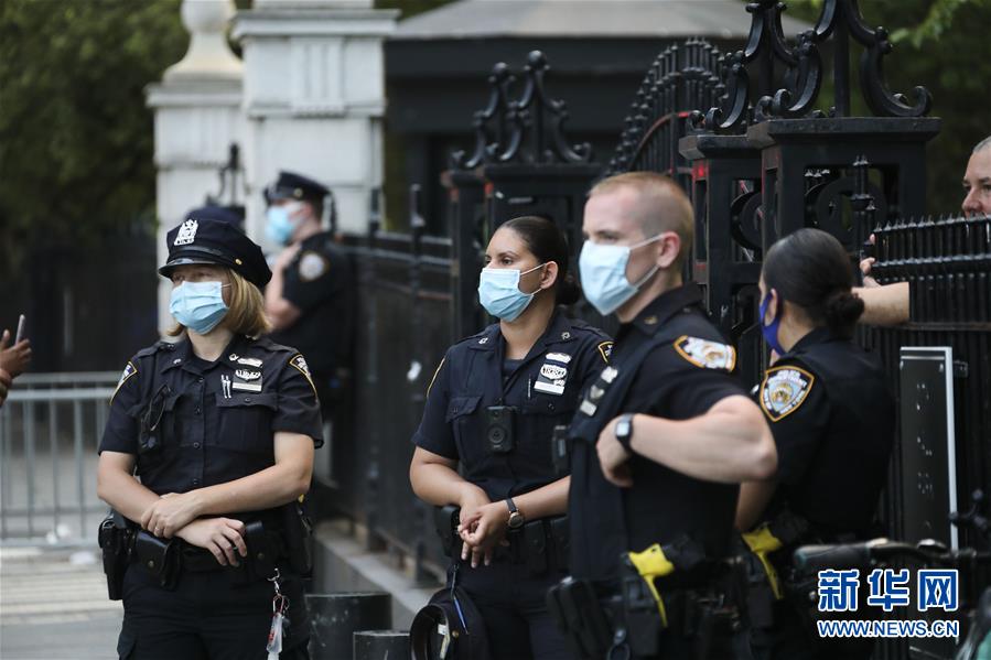6月30日,警察在美國(guó)紐約市政廳附近執(zhí)勤。由美國(guó)明尼蘇達(dá)州明尼阿波利斯市非裔男子弗洛伊德遭白人警察暴力執(zhí)法而死一事引發(fā)的各種抗議活動(dòng)仍在紐約持續(xù)進(jìn)行。新華社記者王迎攝