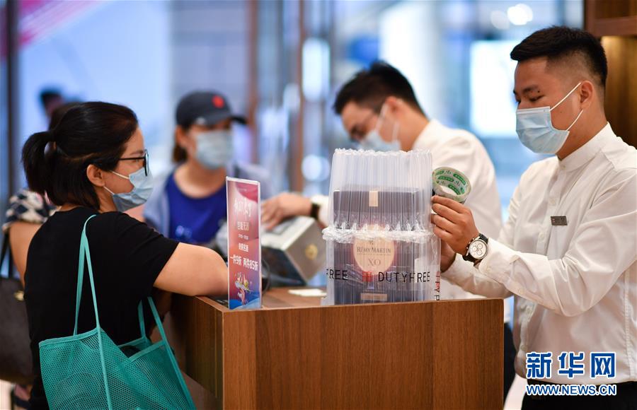 7月1日,??谌赵聫V場免稅店的工作人員為顧客打包酒類商品。當(dāng)日,海南開始實施調(diào)整后的離島免稅購物政策。海南離島旅客每年每人免稅購物額度提高至10萬元,電子消費產(chǎn)品等7類新增商品開售。新華社記者郭程攝