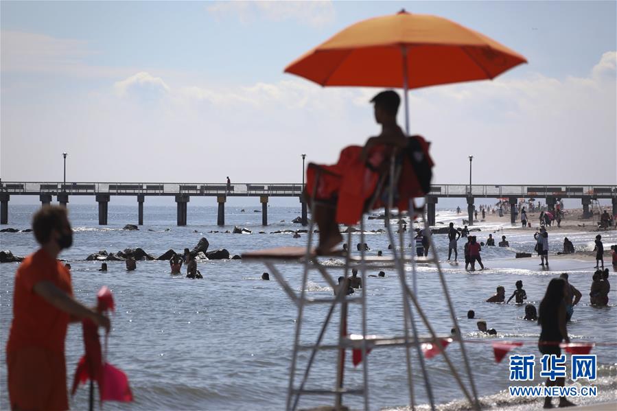 7月1日,人們在美國紐約科尼島戲水。當(dāng)日,美國紐約市屬八處海灘正式重新準(zhǔn)許民眾游泳,救生員也同時(shí)上崗。新華社記者王迎攝