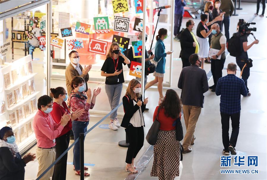 7月1日,法國巴黎蓬皮杜藝術(shù)中心的工作人員鼓掌歡迎參觀者。因新冠疫情關(guān)閉的法國巴黎蓬皮杜藝術(shù)中心于7月1日重新開門迎客。目前,中心只開放6層的臨時(shí)展區(qū)和4、5層的現(xiàn)代藝術(shù)常設(shè)展區(qū)。參觀者需提前網(wǎng)上預(yù)約參觀時(shí)段,11歲以上參觀者須佩戴口罩,參觀過程中保持安全距離。新華社記者高靜攝