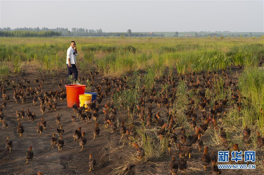7月1日,在黑龍江省五大連池市的草原上,桑慶軍在拋撒飼料喂雞。新華社記者謝劍飛攝