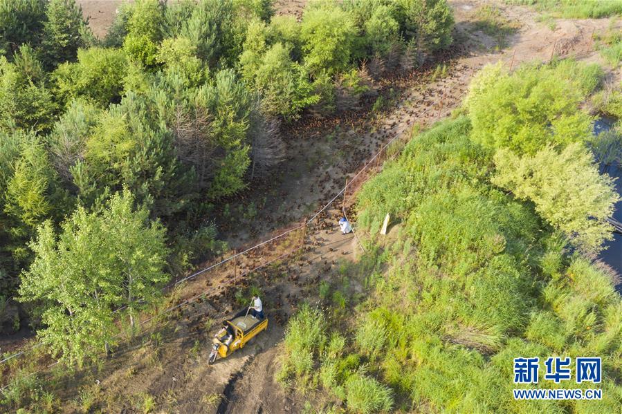 7月2日,在黑龍江省五大連池市的草原上,桑慶軍在喂雞(無(wú)人機(jī)照片)。新華社記者謝劍飛攝
