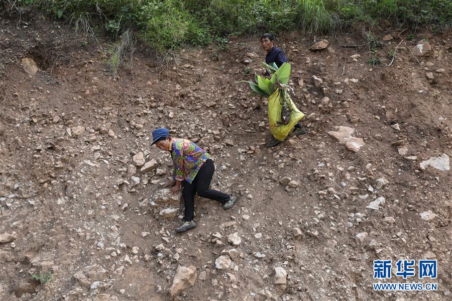 且沙次干、阿達(dá)么日雜夫婦在懸崖峭壁上挖了幾株野生的地涌金蓮花,準(zhǔn)備栽種在新居門前(6月27日攝)。新華社記者 江宏景 攝