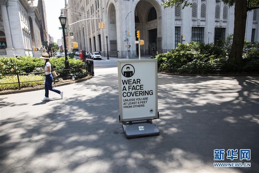7月6日,行人走過美國紐約一處提醒人們佩戴口罩的標牌。新華社記者王迎攝