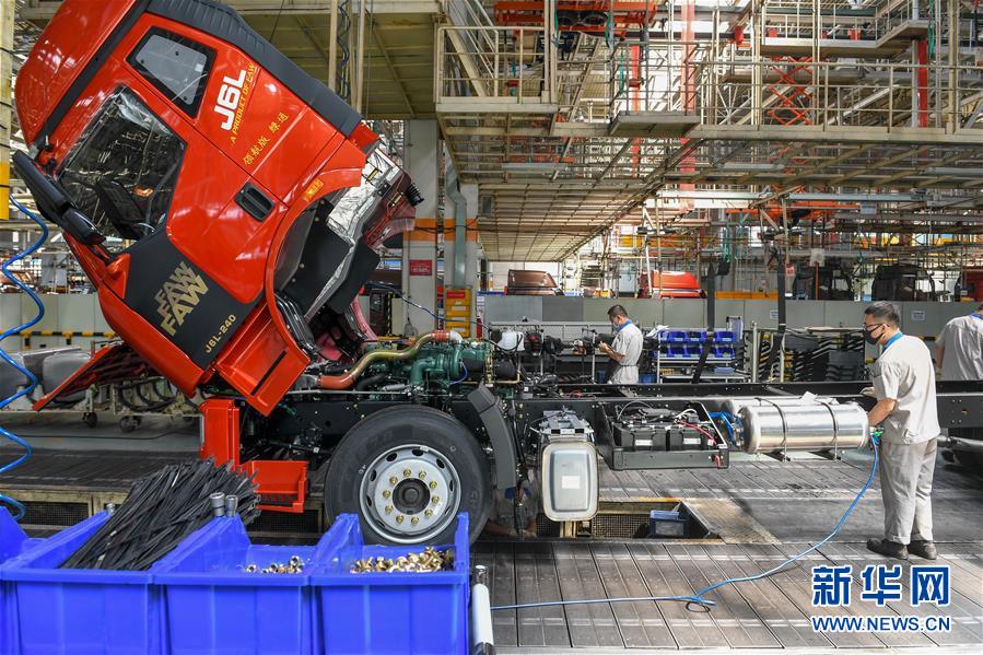 在位于長(zhǎng)春市的一汽解放總裝車間,工人在裝配車輛(6月19日攝)。中國(guó)第一汽車集團(tuán)披露,截至6月30日,集團(tuán)上半年共計(jì)生產(chǎn)整車162.23萬(wàn)輛,同比增長(zhǎng)1.5%;銷售整車163.09萬(wàn)輛,同比增長(zhǎng)2.3%。新華社記者張楠攝
