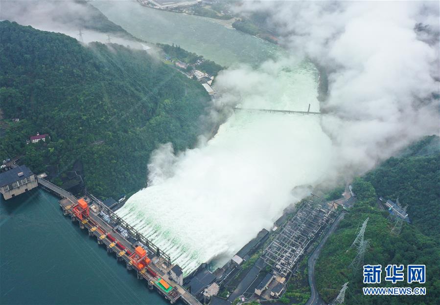 7月8日開(kāi)啟9孔泄洪的新安江水庫(kù)(無(wú)人機(jī)照片)。新華社記者翁忻旸攝