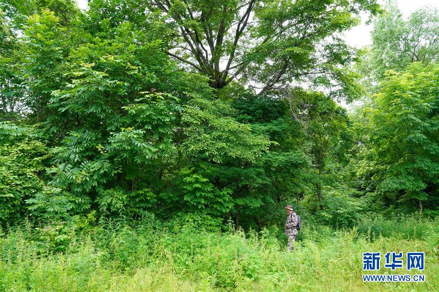 董紅雨在迎春林業(yè)局有限公司施業(yè)區(qū)內(nèi)進(jìn)行野生東北虎蹤跡信息搜集和巡護(hù)工作(7月8日攝)。新華社記者李建平攝