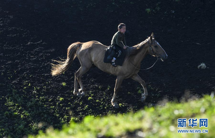 在新疆特克斯縣境內(nèi)的夏牧場里,小朋友跟隨家人一起放牧(6月30日攝)。新華社記者王菲攝