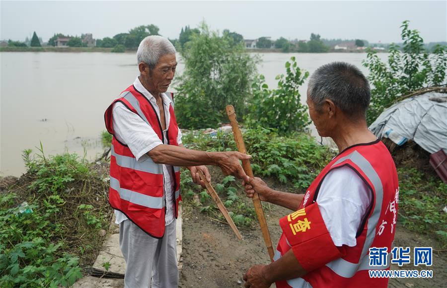 7月9日,在高淳區(qū)陽(yáng)江鎮(zhèn)永豐圩,巡堤員在進(jìn)行“水牌”(巡堤查險(xiǎn)責(zé)任牌)交接。新華社記者季春鵬攝