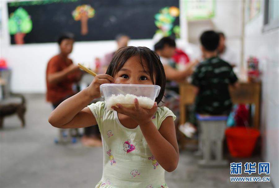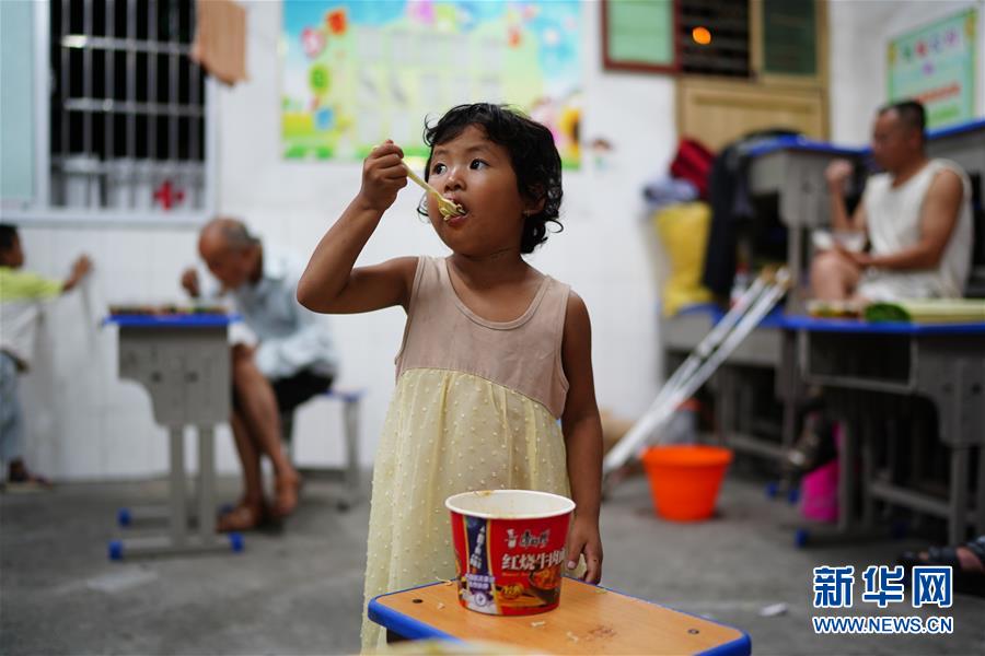 7月9日,小朋友在安置點里吃飯。當日,江西鄱陽縣鄱陽鎮(zhèn)因洪水受災(zāi)的村民被轉(zhuǎn)移到多個集中安置點。在鄱陽縣五一中心學校安置點,志愿者和工作人員接到任務(wù)后不到十小時內(nèi),為被轉(zhuǎn)移村民布置了28間教室,供519人安頓,并為村民發(fā)放褥子、床單、枕頭、盒飯、飲用水等物資。新華社記者周密攝