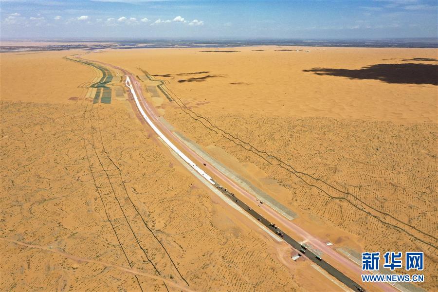 7月10日,位于寧夏境內(nèi)的烏瑪高速青銅峽至中衛(wèi)段A10標段在施工中(無人機照片)。盛夏時節(jié),位于寧夏境內(nèi)的烏瑪(內(nèi)蒙古烏海市至青?,斍呖h)高速青銅峽至中衛(wèi)段正在抓緊施工建設。該路段主線全長122.9公里,其中穿越騰格里沙漠腹地的18公里公路是寧夏建設的首條沙漠高速公路,預計2021年建成通車。新華社記者馮開華攝。