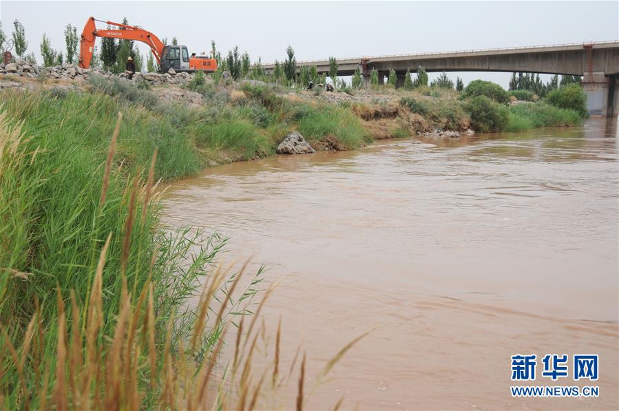 7月11日,工人在黃河內(nèi)蒙古磴口段南套子險工段進行除險加固。新華社記者李云平攝