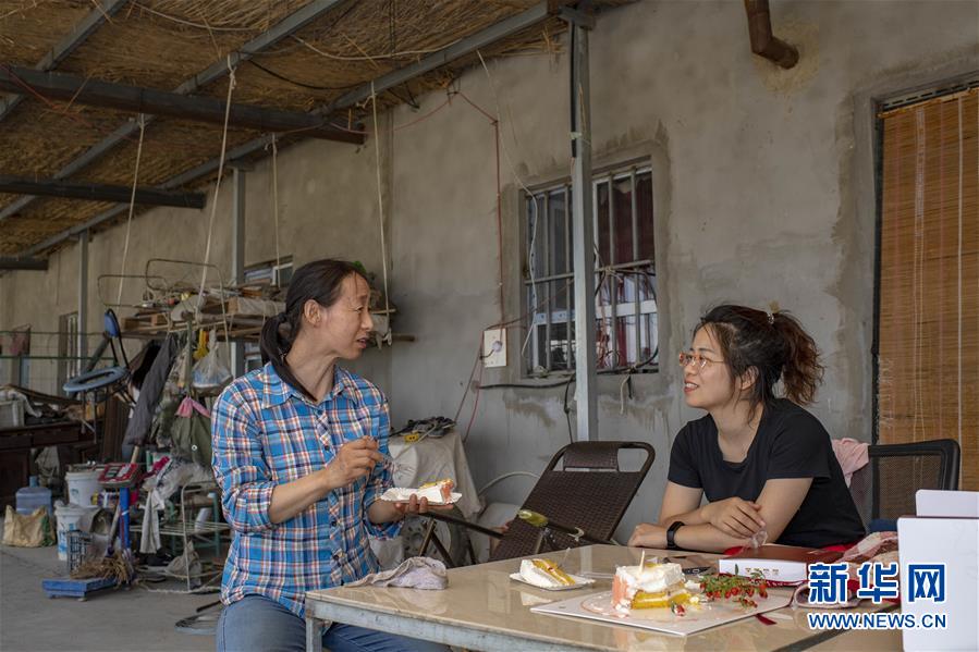在位于新疆精河縣城的一家糕點(diǎn)店,朱虹美團(tuán)隊(duì)在錄制視頻,介紹創(chuàng)意食品——由枸杞果醬、鮮枸杞制作的“枸杞蛋糕”(7月11日攝)。新華社記者 胡虎虎 攝