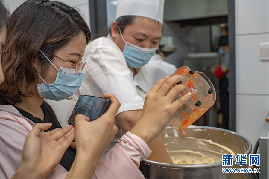 在位于新疆精河縣城的一家糕點店,朱虹美團(tuán)隊在錄制視頻,介紹創(chuàng)意食品——由枸杞果醬、鮮枸杞制作的“枸杞蛋糕”(7月11日攝)。新華社記者 胡虎虎 攝