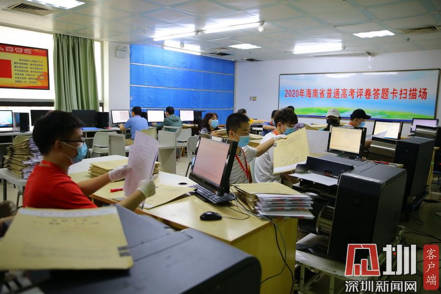 2020年7月13日,在海南師范大學(xué)高考評卷場,工作人員仔細(xì)拆封考卷并進(jìn)行掃描入電腦,整個過程井然有序。在評卷現(xiàn)場的入口,除了有武警把守之外,所有工作人員進(jìn)入到評卷場均有專人使用手柄式金屬探測器對其進(jìn)行安檢,并通過身份證識別系統(tǒng)中進(jìn)行身份識別,方可以進(jìn)入??忌痤}卡由武警24小時值守,并實行嚴(yán)密的視頻監(jiān)控。