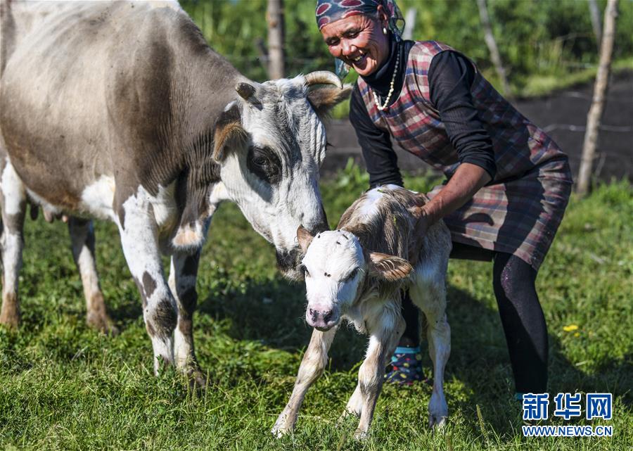 在新疆伊犁特克斯縣境內(nèi)的夏牧場里,一位牧民幫助剛剛出生的牛犢站起來(7月2日攝)。新華社記者 王菲 攝