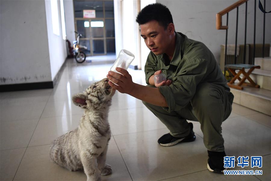 7月13日,動(dòng)物園工作人員許家興給“妞妞”喂水。河北石家莊市動(dòng)物園的孟加拉白虎寶寶“妞妞”只有3個(gè)月大,由于虎媽媽經(jīng)驗(yàn)不足,“妞妞”一出生便由動(dòng)物園工作人員按科學(xué)方法人工飼養(yǎng)。目前,在飼養(yǎng)員的精心照料下,“妞妞”正在茁壯成長(zhǎng)。新華社記者 王曉 攝