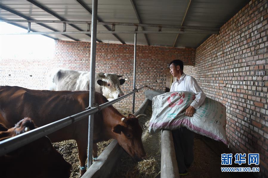 7月14日,高二仁在牛舍內(nèi)給牛喂飼料。新華社記者 李志鵬 攝