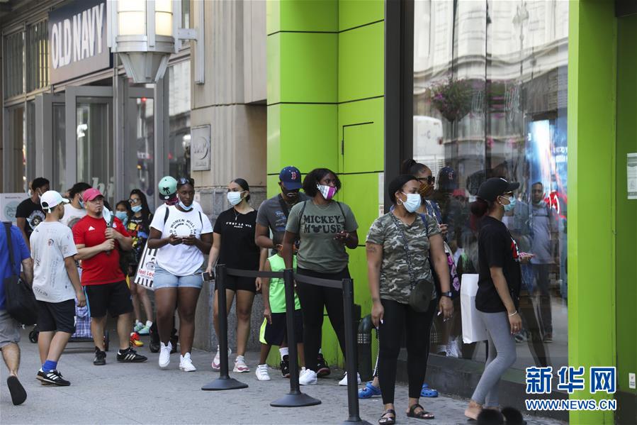 7月14日,人們在美國紐約排隊等待進(jìn)店購物。美國約翰斯·霍普金斯大學(xué):截至北京時間15日6時34分,全球新冠確診病例達(dá)13258016例,死亡病例為576752例。美國是全球疫情最嚴(yán)重的國家,確診病例達(dá)3416222例,死亡病例為136319例。新華社記者 王迎 攝