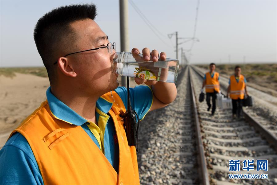 鋼軌打磨機(jī)組的技術(shù)員拿著檢測(cè)設(shè)備前往下一個(gè)檢測(cè)點(diǎn)(7月14日攝)。新華社記者 丁磊 攝