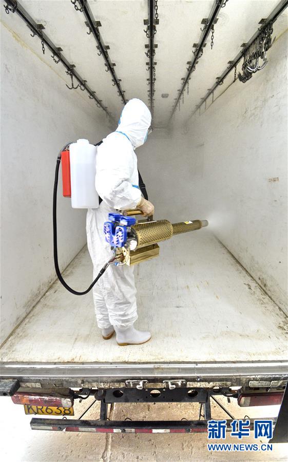 7月15日,北京二商肉類食品集團有限公司員工對冷鏈運輸設備進行消毒。北京二商肉類食品集團有限公司是保障北京肉類市場供應的主要企業(yè)之一。新冠肺炎疫情以來,企業(yè)嚴格實施北京市、農(nóng)業(yè)農(nóng)村部和中國肉類協(xié)會的防疫要求,對進入廠區(qū)的人員、車輛以及原料采購、屠宰分割、產(chǎn)品加工、貯藏運輸、廢棄物收集及污水處理等生產(chǎn)環(huán)節(jié)嚴格防疫,強調(diào)源頭把關徹底消毒。目前,集團公司下屬多家生豬屠宰加工基地正常運營,保質(zhì)保量供應北京市場需求。新華社記者 李欣 攝