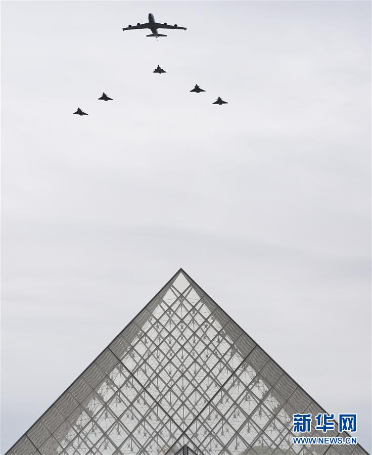 7月14日,在法國巴黎舉行的國慶閱兵式上,法國空軍飛機飛過盧浮宮玻璃金字塔。新華社記者高靜攝