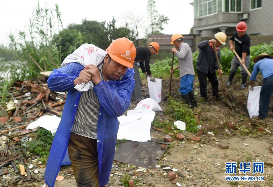 7月17日,防汛人員在秀洲區(qū)新塍鎮(zhèn)小金港村的河道邊加高堤防。浙江省嘉興市秀洲區(qū)處在杭嘉湖平原,受持續(xù)強降雨及上游排水影響,近期,秀洲區(qū)境內(nèi)的京杭大運河分支航道持續(xù)保持較高水位。當?shù)叵嚓P部門嚴陣以待,落實各項措施,確保安全度汛。新華社記者韓傳號攝