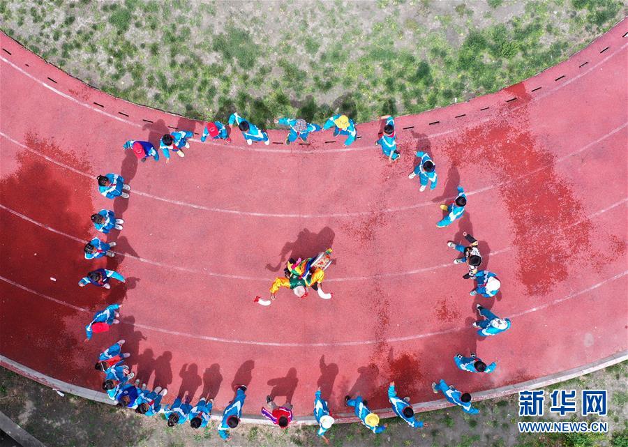 “久河卓舞”傳承人尼瑪在瓊結(jié)縣下水鄉(xiāng)小學(xué)進(jìn)行教學(xué)表演(7月2日攝,無人機(jī)照片)。新華社記者詹彥攝