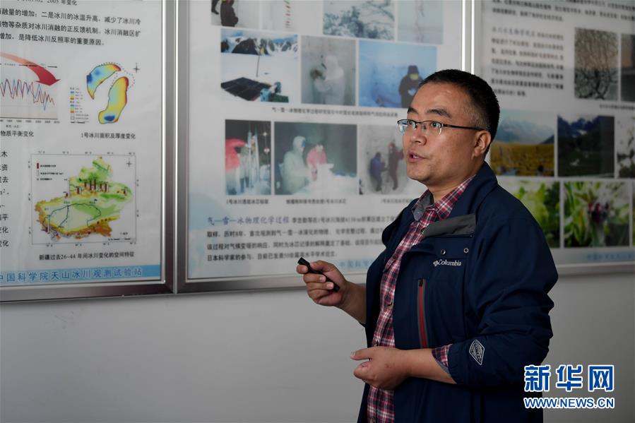7月16日,中國科學(xué)院西北生態(tài)環(huán)境資源研究院天山冰川觀測試驗(yàn)站工程師周平介紹天山一號冰川情況。新華社記者沙達(dá)提攝