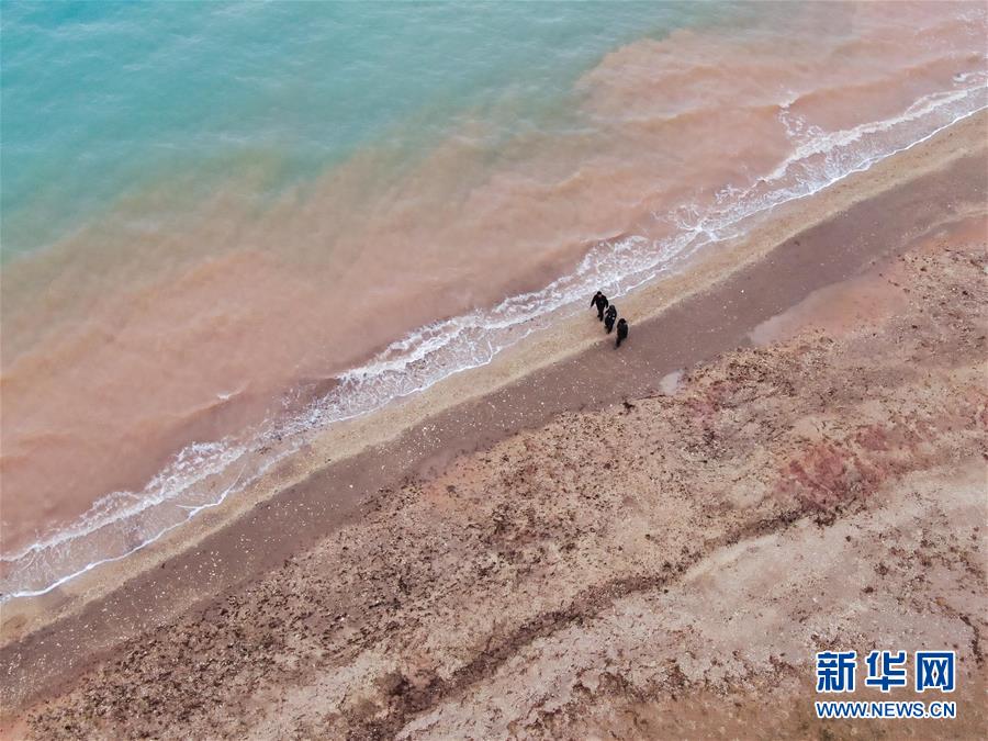 在可可西里索南達杰保護站管護區(qū)域內(nèi)的湖泊附近,龍周才加(中)與隊友才仁多杰(左)、王文豪在巡視(6月30日攝,無人機照片)。新華社記者張龍攝