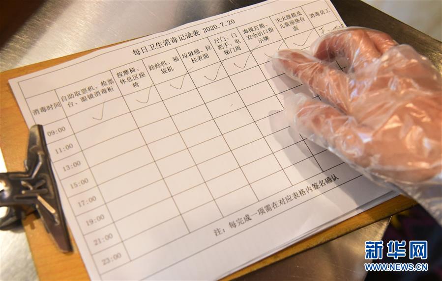 7月20日,濟南新世紀電影城陽光100店的員工在展示消殺記錄。當日,山東濟南市部分電影院在嚴格防控疫情的基礎上陸續(xù)恢復開放。新華社記者王凱攝
