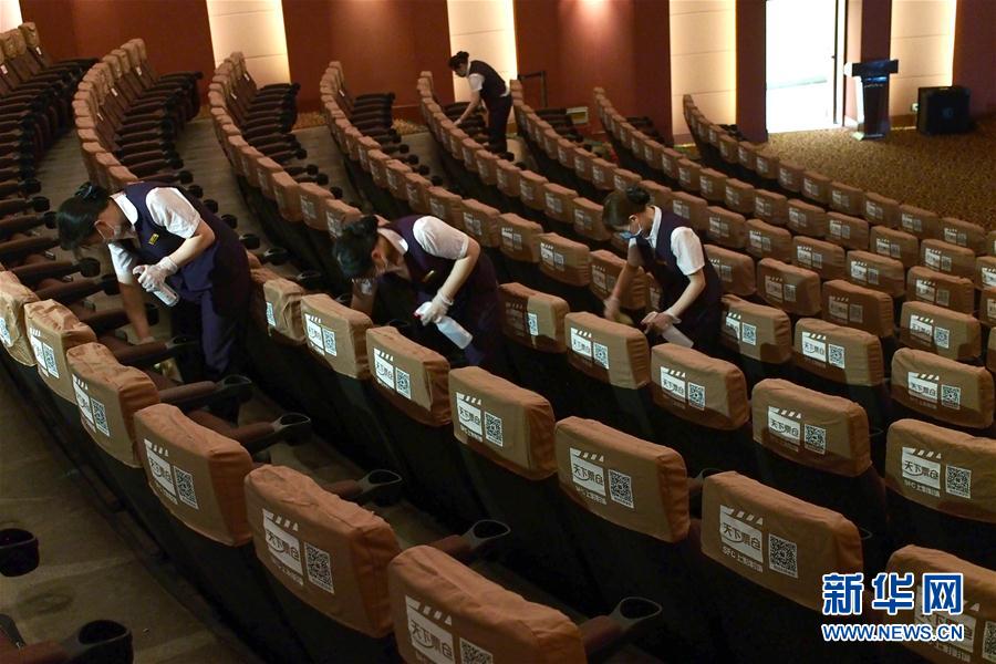 2020年7月19日,上海影城員工在放映廳里為座位消毒。當(dāng)日,上海部分電影院為恢復(fù)開放營業(yè)進行最后階段準(zhǔn)備。新華社記者任瓏攝