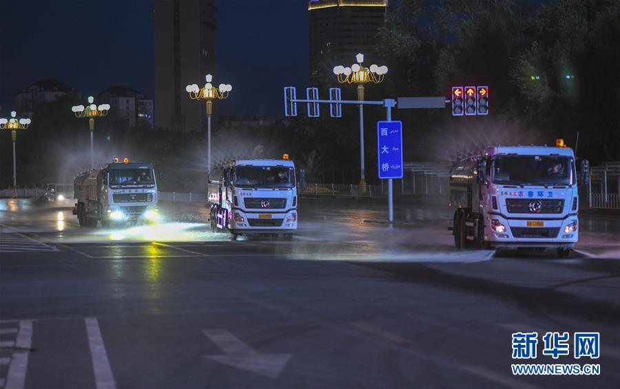 7月20日,烏魯木齊市天山區(qū)城管局清運(yùn)隊(duì)的三臺(tái)工作車(chē)輛在市區(qū)光明路進(jìn)行消殺作業(yè)。烏魯木齊市天山區(qū)城管局自7月17日起,對(duì)天山區(qū)的主次干道76條及235條巷道進(jìn)行集中消殺。目前,烏魯木齊市對(duì)重點(diǎn)區(qū)域進(jìn)行全面消毒消殺。新華社記者趙戈攝