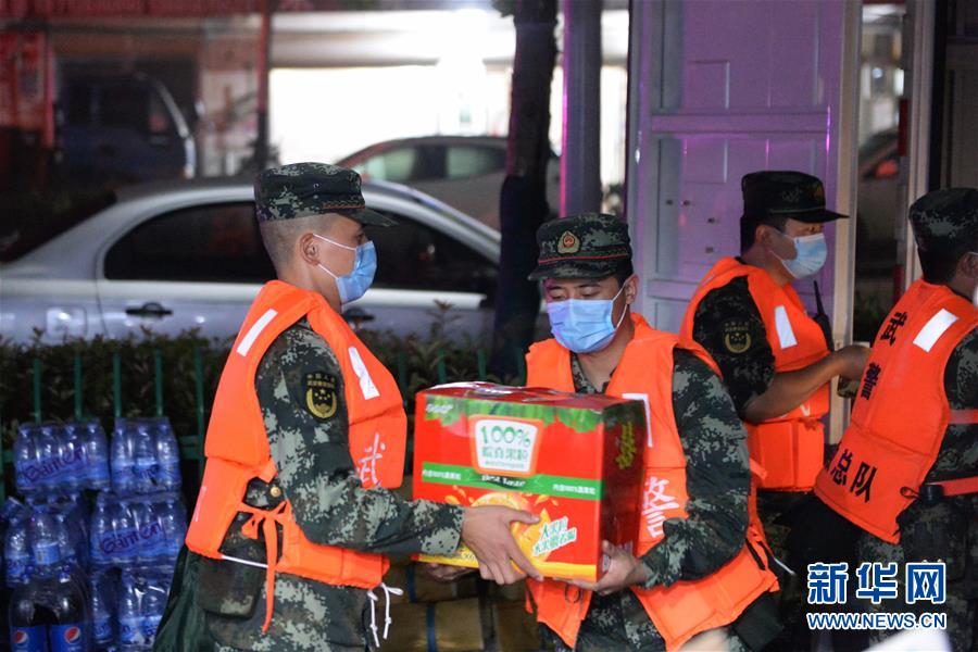 7月20日凌晨,在位于蒙洼蓄洪區(qū)內(nèi)的老觀鄉(xiāng)老觀村,武警安徽總隊(duì)阜陽(yáng)支隊(duì)的官兵幫助一家超市轉(zhuǎn)移貨物。新華社記者黃博涵攝