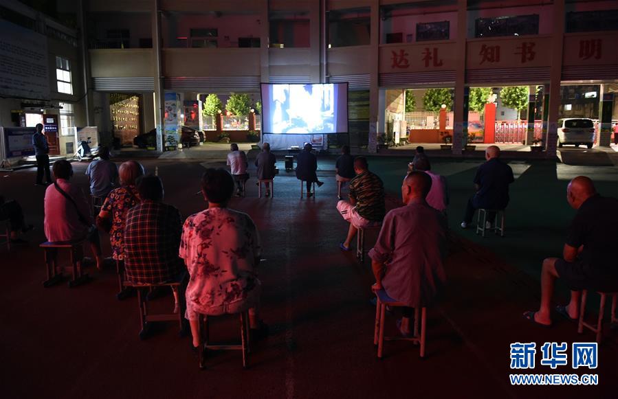 7月20日,轉(zhuǎn)移安置的群眾在安徽省安慶市迎江區(qū)華中路三小集中安置點(diǎn)看露天電影。新華社記者周牧攝