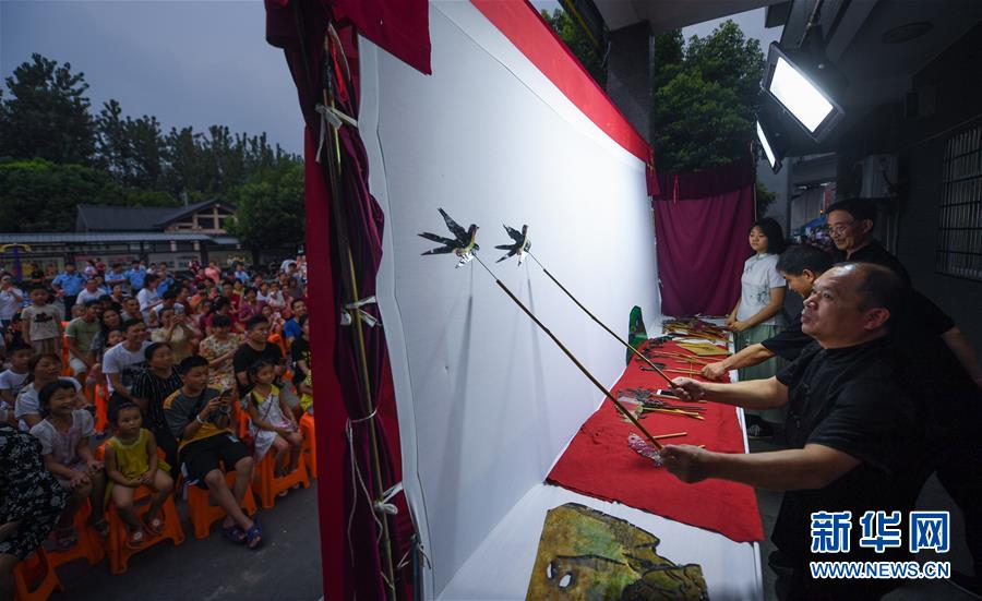 當日,浙江省杭州市余杭區(qū)塘棲鎮(zhèn)河西埭村“衛(wèi)家班皮影戲”劇團的藝人們來到余杭區(qū)喬司街道和睦橋村進行演出,這是近期杭州市余杭區(qū)夏季鄉(xiāng)村“文化走親”的重要活動之一。今年6月開始,杭州市余杭區(qū)塘棲鎮(zhèn)組織多支文化表演團體以“文化走親”的形式,先后送戲到余杭區(qū)近20個鄉(xiāng)村文化禮堂,豐富夏日鄉(xiāng)村百姓文化生活。在余杭塘棲一帶,歷史上曾活躍著一支以演出皮影戲出名的民間戲班子,號稱“衛(wèi)家班”。2016年,塘棲鎮(zhèn)河西埭村在文化禮堂的建設過程中,將當?shù)貍鹘y(tǒng)的“衛(wèi)家班皮影戲”作為“一村一品”特色項目進行了搶救性保護。2018年12月,“衛(wèi)家班皮影戲”被列入杭州市非物質文化遺產(chǎn)代表性項目名錄。新華社記者徐昱攝