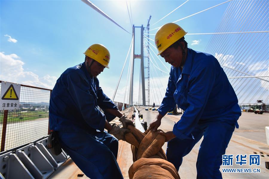 7月22日,施工人員在廣州南沙港鐵路跨西江特大斜拉橋進(jìn)行最后一組斜拉索吊裝作業(yè)。新華社記者劉大偉攝