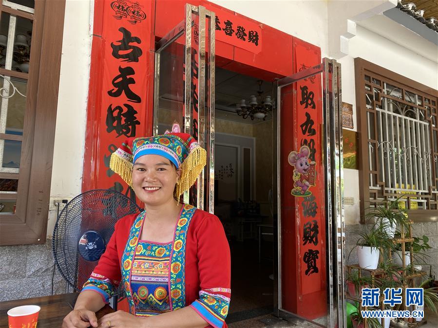 廣西恭城瑤族自治縣蓮花鎮(zhèn)紅巖村村民楊燕紅穿著民族服飾坐在家門口等待客人到來(lái)(7月16日攝)。新華社記者林凡詩(shī)攝