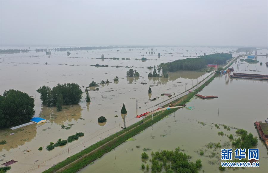這是7月21日拍攝的被淹的南京市高淳區(qū)陽(yáng)江鎮(zhèn)勝利圩(畫面左側(cè))(無(wú)人機(jī)照片)。新華社記者季春鵬攝