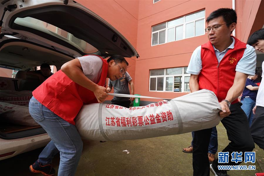7月23日,工作人員在盱眙縣鮑集小學(xué)安置點(diǎn)搬運(yùn)帳篷。當(dāng)日,受淮河盱眙段水位上漲影響,江蘇省淮安市盱眙縣啟動(dòng)鮑集圩行洪區(qū)萬余名群眾撤離轉(zhuǎn)移工作,確保安全度汛。新華社記者韓瑜慶攝