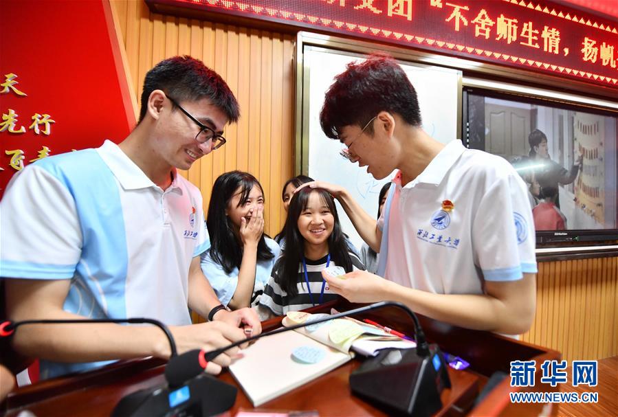 在融水苗族自治縣思源實(shí)驗(yàn)學(xué)校舉辦的支教團(tuán)送別晚會(huì)上,支教老師譚博天(右一)和徐晨曦(左一)收到同學(xué)們的寄語(yǔ)卡片(7月22日攝)。