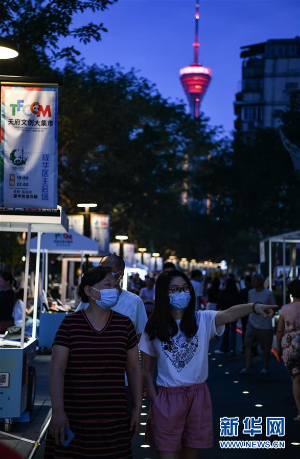 7月23日晚,市民在成都市成華區(qū)望平街濱河路的天府文創(chuàng)大集市上游玩。新華社記者 王曦 攝