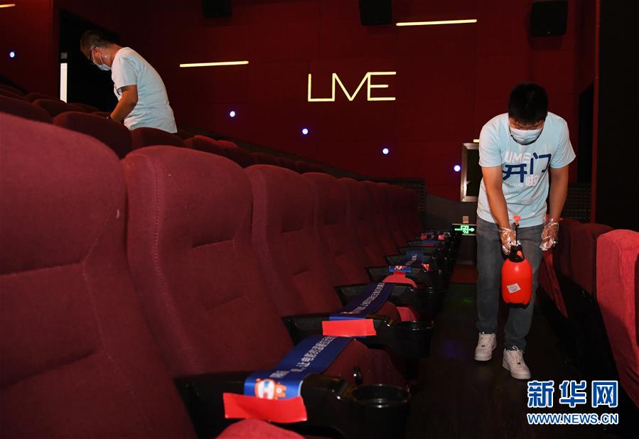 7月24日,在UME影城北京華星店1號(hào)影廳,工作人員進(jìn)行消殺清潔工作。當(dāng)日,在做好新冠肺炎疫情防控的前提下,北京市部分電影院有序恢復(fù)開放。新華社記者 任超 攝